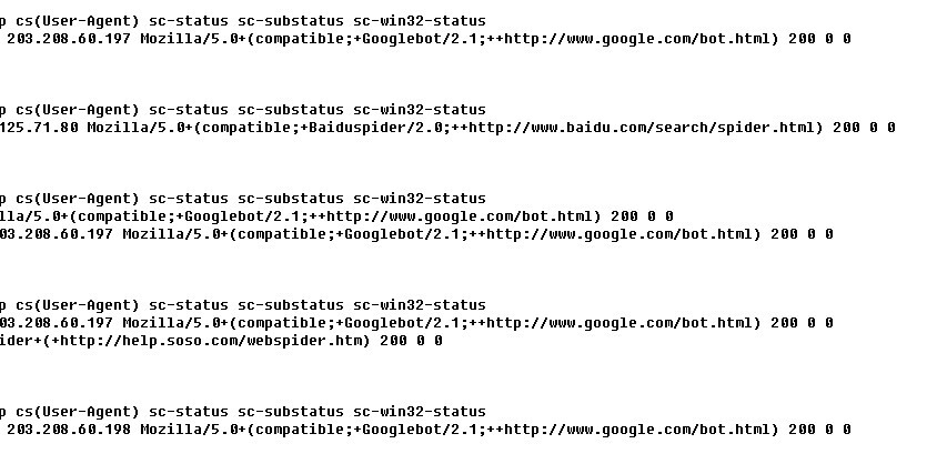 很多人知道百度一直是慢三拍,所以我們也還是一直在堅持著,從下面的圖片我們也可以看出,百度抓取的痕跡。這張圖片是唯一兩者在一起的圖片,從200返回的信息來看 5:1的比例,谷歌抓取了5個頁面,而百度只抓取了一個頁面。中間還有個插曲SOSO。因為電腦屏幕太小不能給大家展示的很多。