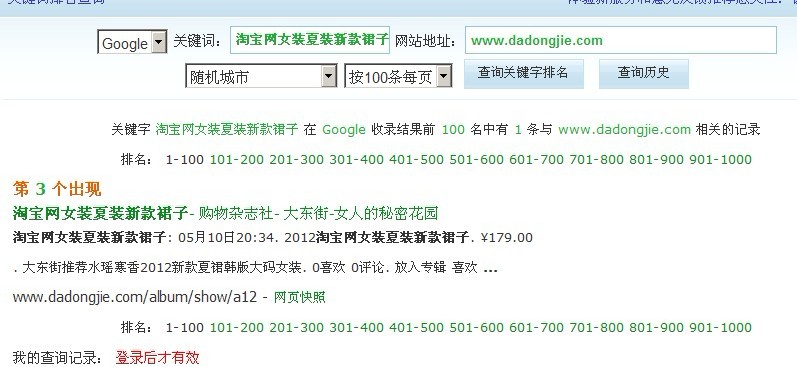 因為是兩家的不同的公司,所以算法是不同的。當(dāng)我們在百度搜索(淘寶網(wǎng)女裝夏裝新款裙子)是找不到大東街這個網(wǎng)站的,因為沒有收錄。而在百度我們測試了下在谷歌首頁的第三位,通過百度指數(shù)查詢,關(guān)鍵期的指數(shù)為770很顯然是一個流量比較大的詞。這個詞做上去,大部分的第三方百度權(quán)重會顯示成3。那么很顯然在谷歌上我們的優(yōu)勢會很大,至于為什么筆者也不知道。只能說筆者的網(wǎng)站細(xì)節(jié)方面做的比較適合谷歌吧!