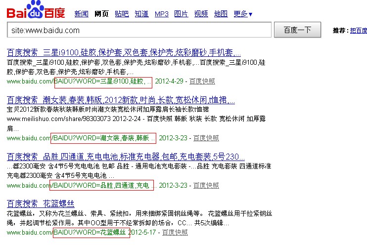 通過(guò)圖片我們可以發(fā)現(xiàn),百度搜錄了大量的百度搜索的頁(yè)面。百度這樣大量的制造重復(fù)的搜索結(jié)果意欲何為?