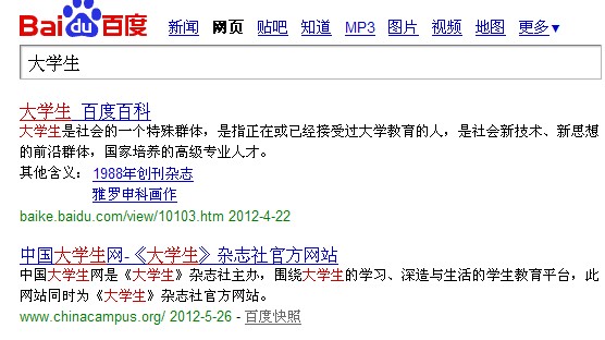 首先我們要了解百度分詞的條件,并不是所有的詞都會(huì)有分詞產(chǎn)生,例如我們搜索“大學(xué)生”,返回的結(jié)果,我們會(huì)看到精準(zhǔn)匹配,那么百度就對(duì)這個(gè)詞沒有進(jìn)行了分詞處理,看下圖: