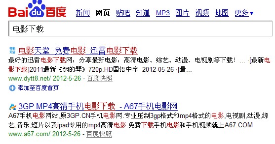 而我們搜索“電影下載”,百度就會(huì)將這些詞拆分為“電影”、“下載”和“電影下載”,如下圖:
