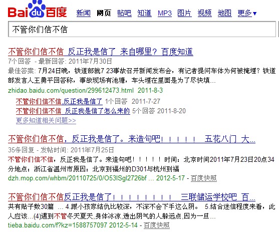 例如大家搜索“不管你們信不信”,一般來說這樣的句子肯定是要被分詞處理的,但是因?yàn)槿ツ陝?dòng)車事件,這個(gè)句子已經(jīng)成為大家常用的詞語,百度也已經(jīng)對(duì)這個(gè)詞比較認(rèn)可了,將他收入詞庫中,那么它就可以實(shí)現(xiàn)精準(zhǔn)匹配。如下圖,網(wǎng)頁標(biāo)題中都是精準(zhǔn)匹配,未見分詞匹配: