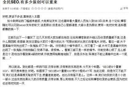 一位SEOER在帖子中不無憂慮地寫道:“.到處都是一樣的內容,沒有創(chuàng)新,沒有新的東西進來,今天發(fā)個標題:‘SEO的8個重要XXX’,明天……‘SEO的4個重要XXX’把8個捏成4個寫……但是你又不能不寫,我們還是得厚顏無恥的寫下去”。