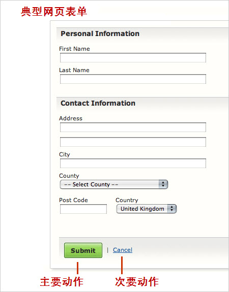 一個典型的網(wǎng)頁表單,通常帶有一些“結(jié)束性”動作-比如【提交】、【保存】或者【繼續(xù)】-用于完成表單任務(wù)。因為這些動作會觸發(fā)表單的最重要的行為(結(jié)束表單),所以它們通常屬于主要動作。