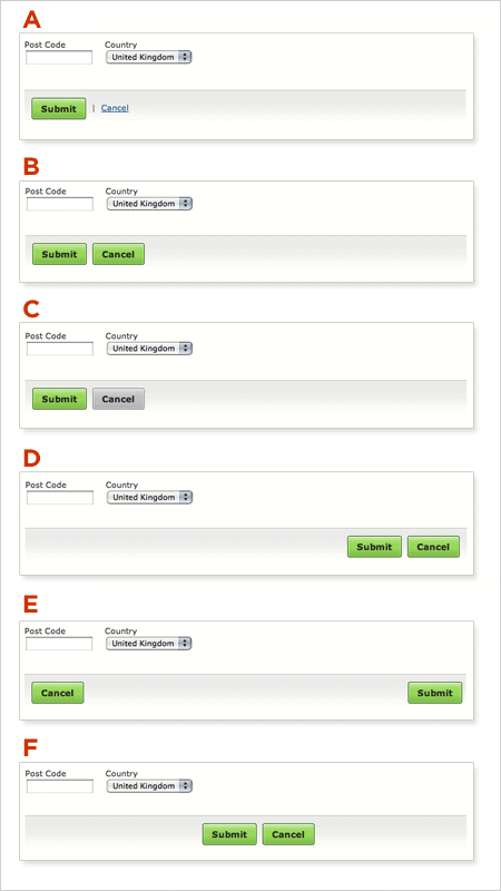 根據(jù)我們收集的數(shù)據(jù)顯示,A、B、C方案是最有效的三個。這三個原型有著一個共同特點:【提交】【取消】按鈕全部放置在頁面左側(cè)。這說明這兩個操作的最佳設(shè)計選擇是左對齊 - 特別當表單控件也同樣左對齊時。把這兩個按鈕放在左側(cè)也使得用戶眼睛移動的距離最少。