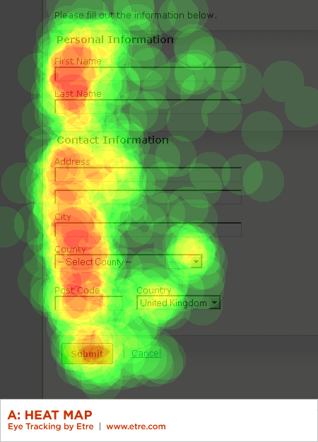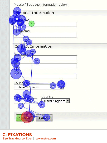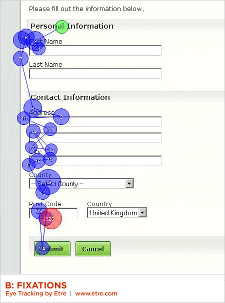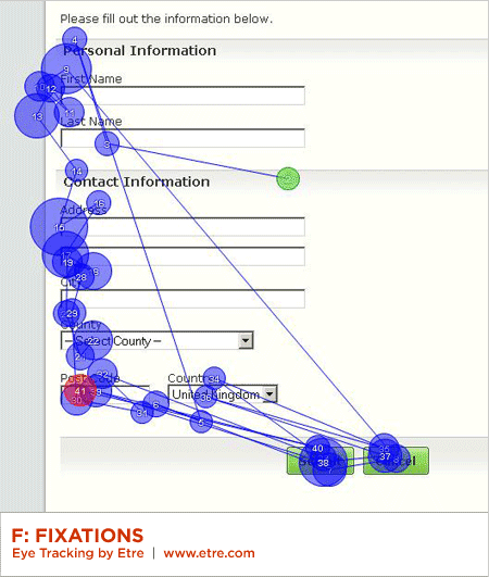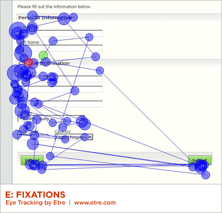 近幾個月來,我一直忙于我的新書《網(wǎng)頁表單設(shè)計最佳實踐》,使用大量的真實案例數(shù)據(jù)對一些設(shè)計規(guī)范進行提煉。接近尾聲的時候,我有幸參加了Etre設(shè)立于倫敦的可用性團隊組織的一些研究工作。這些研究主要是針對網(wǎng)頁表單設(shè)計的特定元素,進行了一些眼動追蹤和可用性測試。其中一項測試,重點考察了網(wǎng)頁表單中主次要動作的差異。