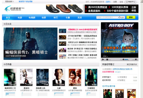迅雷看看嚴格說不能算是獨立的視頻網站,但目前的人氣也是極速狂飆,依靠迅雷豐富的資源逐漸對其他視頻網站產生了很大壓力。最近迅雷看看剛剛改版,上圖是最新改版的頁面,由于迅雷看看定位非常清楚,放棄原創(chuàng)視頻和一些短片,專注于電視、電影、動漫、綜藝,頁面第1屏都是時下最流行的電影電視等,每個電影下面有用戶的推薦指數(shù),我個人覺得迅雷看看的首頁設計直接了當?shù)淖プ×擞脩粜枨;頁面右側的觀看記錄是個非常貼心的設計,提醒用戶之前曾看過哪些電視電影,是否還要繼續(xù)看下集,我每次都會用這個功能。