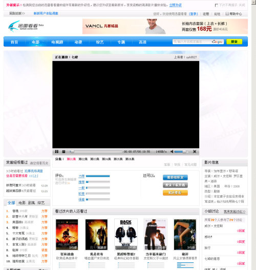 迅雷看看和土豆一樣也是采用居中播放,而且還變寬了,但2側目前還是空著的,不知道以后會不會放廣告。迅雷看看最大的特點是把電影自動裁剪能若干個小段落,這樣在緩存時速度更快,如果是連續(xù)劇的話會整理好每一集形成列表,用戶無需再重新搜索下一集,這是其他視頻網站無法做到的,有點B2C的感覺。迅雷看看在用戶體驗上還特別考慮到用戶之間的聯(lián)系,“看過該片的用戶還看過”這個功能非常人性化的,喜歡同一片的用戶他們的喜好可能是一樣的,這個功能被使用的也是很廣泛,當當網就有類似的功能。