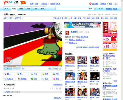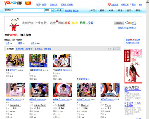這頁搜索框又回到右側了,優(yōu)酷的播放區(qū)域是靠左側,寬度大概占了半個屏幕,播放區(qū)域下側是一些常用的用戶行為按鈕,比如收藏、引用等;右側是視頻信息及相關視頻,整個第一屏涵蓋了主要的信息,用戶可以一目了然無需拖動滾動框。但整個頁面的廣告部分有點亂,雖然設計師把廣告放在右側盡量不影響用戶的瀏覽,但由于google AD這種是隨機產生內容,有時會出現(xiàn)八桿子打不到一起的廣告內容,因此頁面會顯得比較凌亂,我個人并不太贊成放google ad這樣的廣告,或者是一個頁面不要放太多不同類型的廣告。