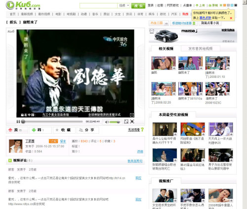 酷6也是采用靠左側播放的設計,和優(yōu)酷不同的是視頻信息放到了播放區(qū)域下面,右側則是相關視頻及推薦視頻,我覺得這樣也是不錯的設計,頁面廣告的位置也較為合理,主要分布在視頻的緩存中、右側1個和底部這3處,不影響整個頁面的布局和用戶的瀏覽;另外酷6最近加了一個換皮膚功能,在頁面的右上角上可以選擇4種不同的皮膚顏色,這個個性化設計非常討巧,可滿足不同用戶的顏色喜好,只不過要注意部分廣告和不同皮膚顏色的搭配問題。