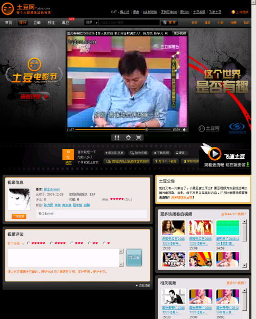 土豆播放頁的布局是比較大膽的,采用居中播放+大背景廣告的形式,而且整個頁面采用黑色背景;我想設計師是想給用戶一個在電影院看電影的感覺,我個人是滿喜歡這種設計的,雖然變成了黑色,但頂部導航欄布局沒有發(fā)生任何變化,對用戶的影響其實并不大。而且土豆近期在播放功能上下了功夫,除了像飛速土豆這樣的軟件外,在線還可以調視頻亮度,這是非常實用的功能。不過由于這種居中的設計,相關視頻和推薦視頻的區(qū)域就被迫放到第2屏,用戶瀏覽起來會造成不便,如果能把相關視頻放在視頻左側做成彈出式的設計也許會更好。