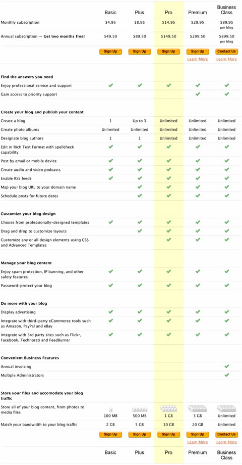 TypePad (如下截屏)為用戶提供了冗長的價(jià)目表。盡管它提供了詳盡的信息使得用戶能夠?qū)Ρ瘸錾唐分g的差異,但是用戶根本無法一目了然,他們不得不記住哪一列對(duì)應(yīng) 到哪一個(gè)商品。此外,盡管商品名稱在列表底部尚有顯示,但價(jià)格卻只在列表開頭出現(xiàn)。因此用戶在瀏覽到表格下方的時(shí)候不得已還得重新滾動(dòng)到列表開頭查看商品 價(jià)格。