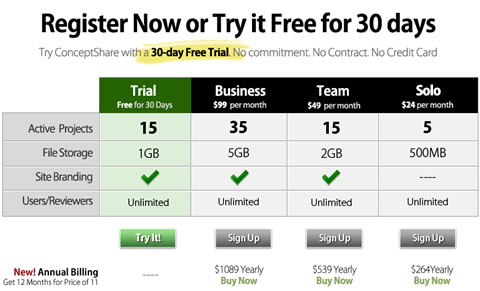 相比之下 ConceptShare 就是個(gè)簡(jiǎn)明易用的典型。注意:列表第四行合并了兩項(xiàng)(用戶和評(píng)審者),從而避免不必要的第五行出現(xiàn)。這是個(gè)美觀且信息充足的價(jià)目表。
