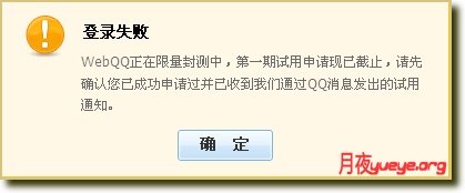 當(dāng)然,如果您的網(wǎng)速夠快,通常看不到這樣一個(gè)頁(yè)面,而會(huì)直接跳轉(zhuǎn)到登錄成功后的WebQQ頁(yè)面;而如果你的機(jī)器較差,或者網(wǎng)速較差,又或者有點(diǎn)RPWT,那么你可能需要等待一會(huì)兒,甚至需要強(qiáng)制刷新一下。而沒(méi)有通過(guò)封測(cè)邀請(qǐng)的朋友,如果你登錄,可能也會(huì)碰到這個(gè)頁(yè)面,強(qiáng)制刷新,則會(huì)彈出消息,提示你: