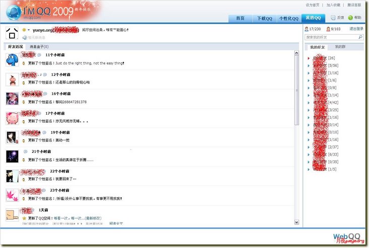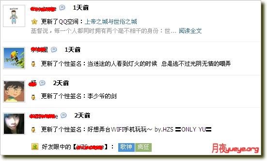 在好友近況里顯示的信息甚至比QQ上顯示的還要直觀,還要全面,我們可以清晰地看到QQ好友的頭像、昵稱,QQ空間更新以及QQ簽名檔的更換等信息;不過(guò)略顯遺憾的是,WebQQ “好友近況”里面只顯示了QQ好友的昵稱,而未能顯示出我們對(duì)好友的備注信息,稍微有些不便。
