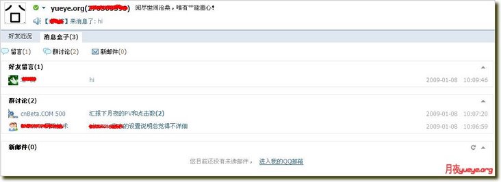這些消息包括QQ好友的留言,QQ群消息,以及QQ郵箱中的新郵件等等。這里還是有些不足,月夜覺(jué)得點(diǎn)擊其中的“進(jìn)入我的QQ郵箱”鏈接應(yīng)該直接進(jìn)入到對(duì)應(yīng)的QQ郵箱中,不過(guò)遺憾的是,只能打開(kāi)QQ郵箱登錄頁(yè)面,還需要填寫(xiě)信息才能登錄。