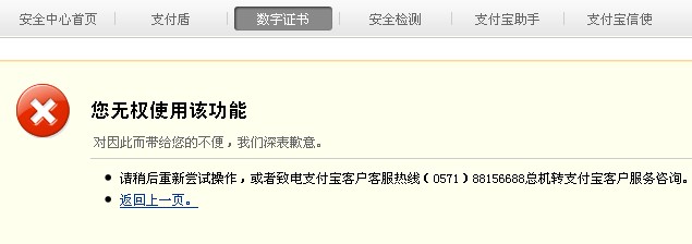安裝密碼輸入控件→→→登入支付寶→→→進(jìn)行安全檢測→→→發(fā)現(xiàn)沒有數(shù)字證書,引導(dǎo)進(jìn)入數(shù)字證書導(dǎo)入頁面→→→導(dǎo)入證書,輸入密碼→→→錯誤提示“導(dǎo)入證 書失敗,請返回重新選擇。錯誤原因:Undefined”(下圖1)→→→返回,選擇注銷數(shù)字證書→→→引導(dǎo)進(jìn)入注銷數(shù)字證書頁面,選擇用手機(jī)方式注銷→→→輸入手機(jī)驗(yàn)證碼→→→錯誤提示“您無權(quán)使用該功能,返回上一頁”(下圖2)→→→點(diǎn)擊返回,繼續(xù)收到手機(jī)驗(yàn)證碼→→→繼續(xù)…..進(jìn)入死循環(huán)狀 態(tài),手機(jī)收件箱被塞滿了驗(yàn)證碼,我抓狂了
