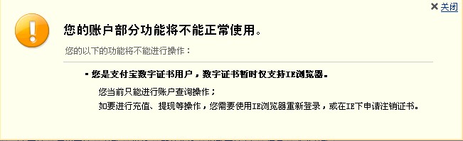 我以為這個證書在IE下導(dǎo)入之后,在firefox下也可以使用,于是切換回到firefox,此時,支付寶提示“數(shù)字證書暫時僅支持IE瀏覽器”(如下圖3)