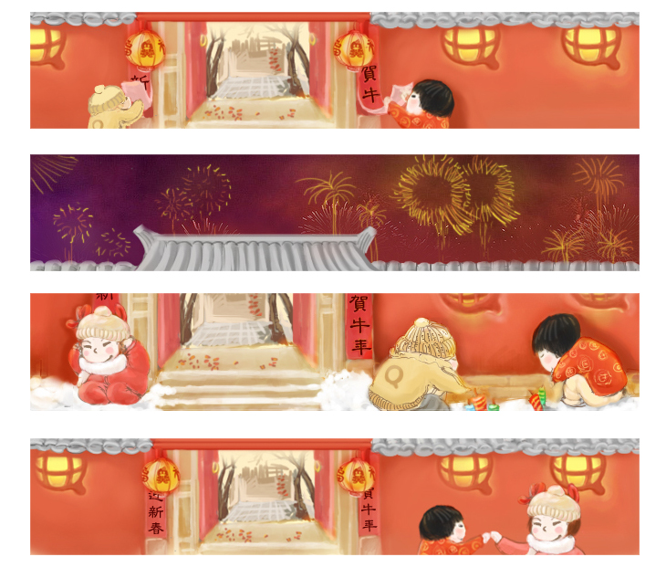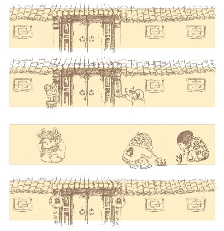 眾人腦爆得出三種改革方向:其一,保持原有單幀畫面形式,采取文字組合方式進(jìn)行繪制,強(qiáng)調(diào)品質(zhì)。其二,采用動(dòng)態(tài)場(chǎng)景形式,以小范圍的動(dòng)畫,如飄雪,星星閃爍等,增強(qiáng)Banner趣味性,豐富表現(xiàn)形式。其三,劇情或故事形式,突出情節(jié),分段展示,使用戶更好地融入節(jié)日氛圍。在會(huì)議之后的小范圍的討論中,眾人亦積極提供方案,托哥提出不能浮于表面,止于視覺(jué)表現(xiàn),從而導(dǎo)致表意直白而不含蓄,缺乏內(nèi)涵的情況,亦給出領(lǐng)導(dǎo)之前提出從郵票上尋找靈感的建議。最后確定用劇情及故事形式作為新形式嘗試設(shè)計(jì)。確認(rèn)這個(gè)方向之后,在符合整體思路情況下,以春節(jié)作為試點(diǎn),進(jìn)行了初稿設(shè)計(jì),在尋找春節(jié)相關(guān)資料時(shí)發(fā)現(xiàn),傳統(tǒng)春節(jié)的習(xí)俗保留到現(xiàn)在的已不多,而且在不同地區(qū),方式也有所區(qū)別,不過(guò)貼春聯(lián),節(jié)前打掃衛(wèi)生,放鞭炮等習(xí)俗還是一直保留著,即使在最繁華的都市里也如此。于是在草稿設(shè)計(jì)階段,用春聯(lián),鞭炮,小孩新衣裳等傳統(tǒng)元素,突出春節(jié)氣氛,并結(jié)合節(jié)前節(jié)后相關(guān)習(xí)俗進(jìn)行繪制:
