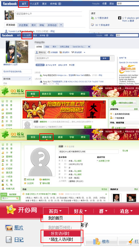 由上述分析再來(lái)看facebook的改版、QQ校友的一級(jí)導(dǎo)航,就明白為什么要把“首頁(yè)”和“我的主頁(yè)”并列分開且采用不同的界面結(jié)構(gòu)與內(nèi)容: