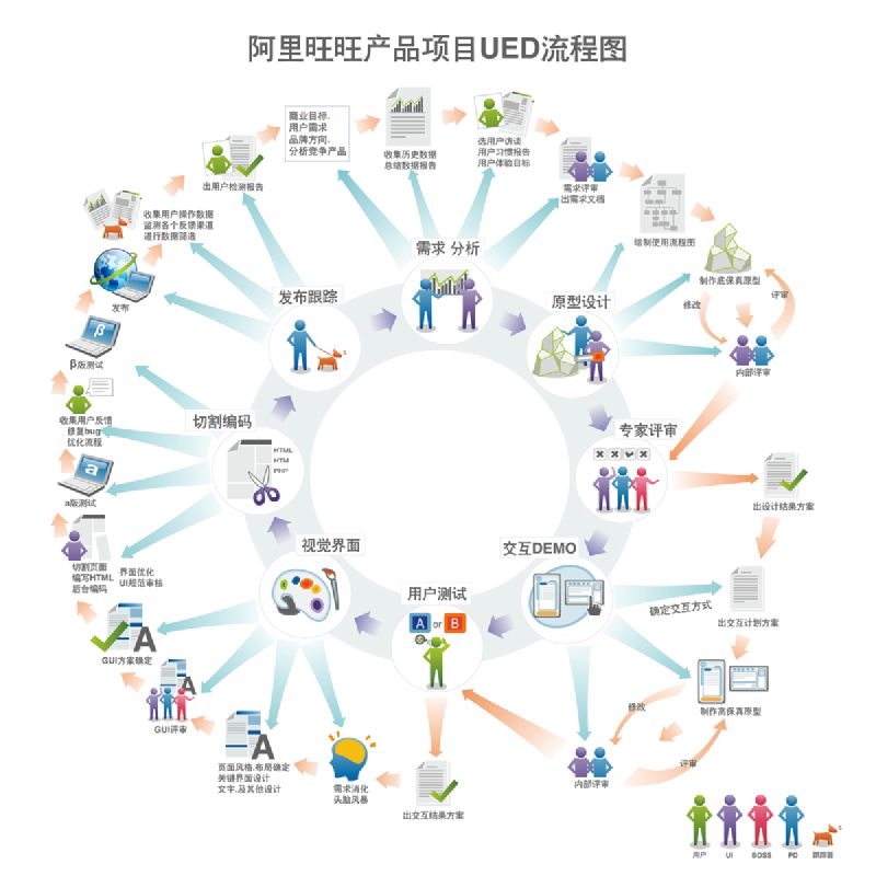 偶然看到的阿里巴巴一張產(chǎn)品設(shè)計(jì)流程圖,對(duì)比了一下目前mtime的產(chǎn)品流程設(shè)計(jì),發(fā)現(xiàn)基本上是一模一樣的。看來國內(nèi)主流的互聯(lián)網(wǎng)公司的產(chǎn)品研發(fā)流程基本一致。我也簡(jiǎn)單講解一下,說不定可以幫助到有志成為互聯(lián)網(wǎng)UED設(shè)計(jì)者的后來人。