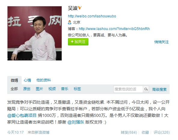 拉手網(wǎng)吳波效仿劉強(qiáng)東微博設(shè)賭 辟謠事件營(yíng)銷兩不誤