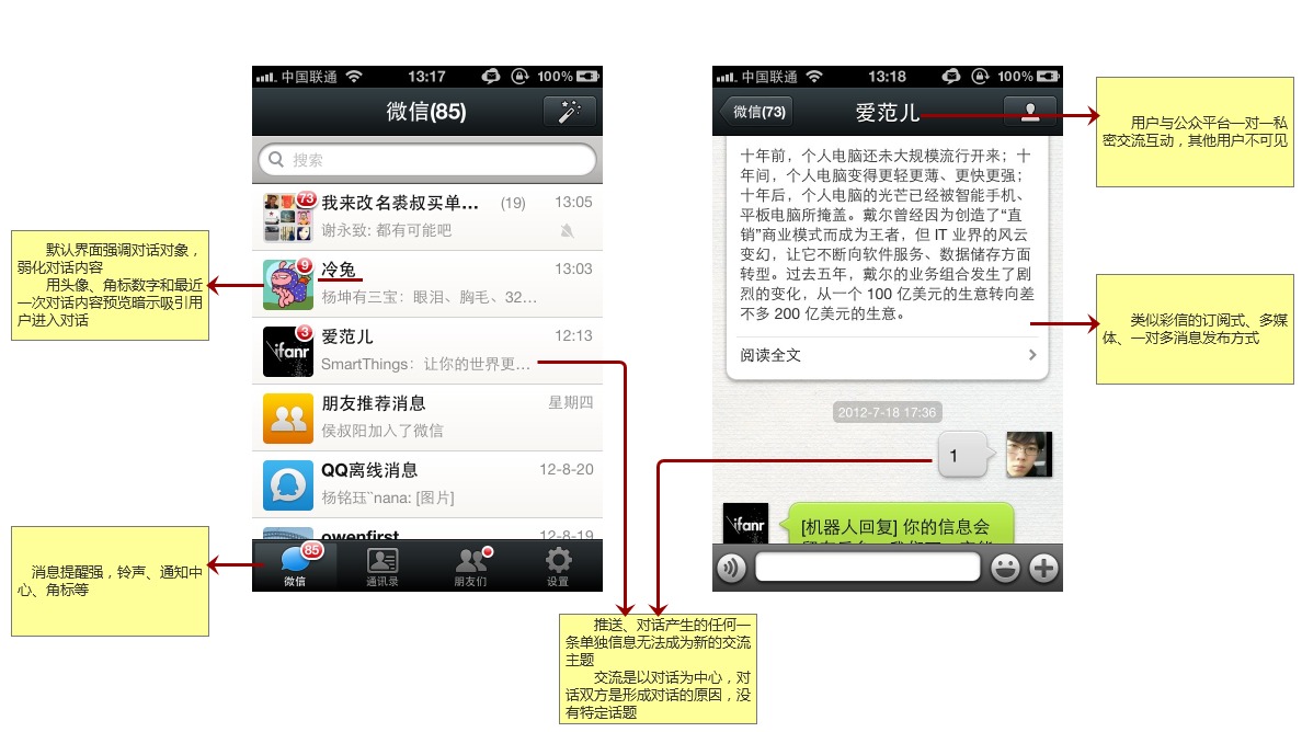 ⑥ 微信主產(chǎn)品是由KIK、TalkBox等移動(dòng)即時(shí)通訊工具的產(chǎn)品形態(tài)衍生而來(lái),天生具有很強(qiáng)的提醒力度(鈴聲、通知中心消息停駐、角標(biāo)等);