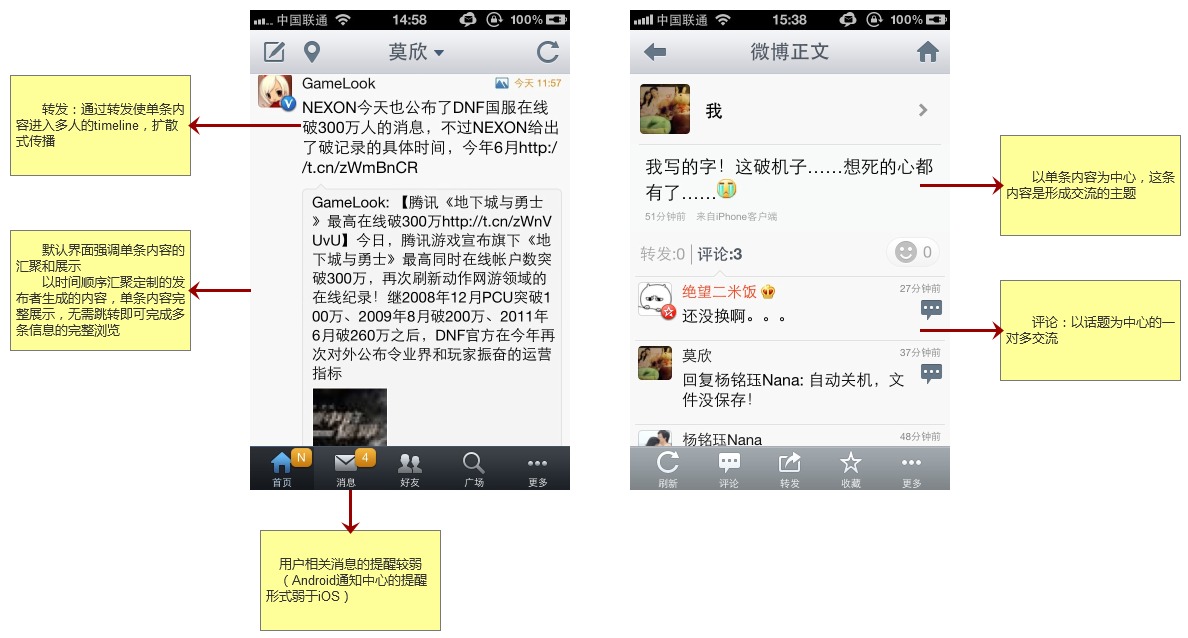② 微博的主要信息維度是單條信息,單條信息之下允許以評(píng)論的形式,以這條信息為中心話題進(jìn)行一對(duì)多的公開(kāi)交流;