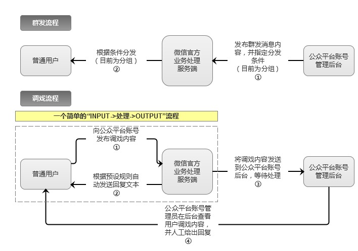 下圖是我簡(jiǎn)單繪制的微信處理“群發(fā)”和“調(diào)戲”兩類(lèi)業(yè)務(wù)的處理流程: