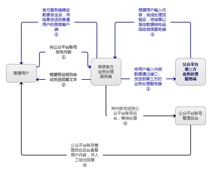 正如圖中所示,其實(shí)普通用戶(hù)向公眾平臺(tái)賬號(hào)發(fā)送一條消息,公眾平臺(tái)賬號(hào)在人工處理這條消息前,系統(tǒng)根據(jù)預(yù)設(shè)規(guī)則自動(dòng)發(fā)送的回復(fù),就是一次簡(jiǎn)單的“輸入->處理->輸出”的處理流程。
