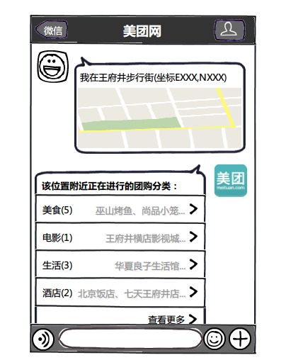 ① 將自己的位置信息在微信中發(fā)送給美團(tuán)網(wǎng),美團(tuán)網(wǎng)馬上返回該位置周?chē)膬?yōu)惠信息: